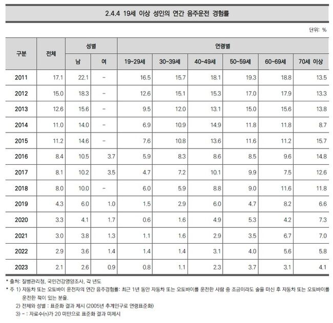 성인 음주운전 경험률은 2011년 17.1%에 달했으나 이후 꾸준히 감소해 2016년 처음으로 10% 아래로 내려왔고, 2023년에는 2% 초반까지 내려왔다.