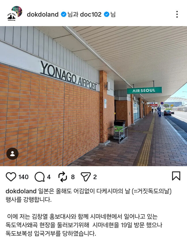 독도사랑운동본부 측은 22일 SNS를 통해 지난 19일 요나고 공항에서 벌어진 상황을 전했다. 단체는 김씨와 함께 시마네현의 역사 왜곡 현장을 확인하려 했지만 일본 측이 1999년 음주운전 전력을 이유로 즉시 출국 조치했다고 설명했다. 동행한 관계자 역시 장시간 조사와 소지품 검색을 받은 뒤 독도 홍보 활동 목적이라는 이유로 입국이 허용되지 않았다고 밝혔다.