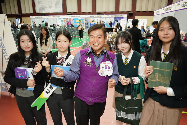 10월 26일 열린 동대문구 미래교육박람회에서 이필형 동대문구청장이 학생들과 기념 촬영을 하고 있다