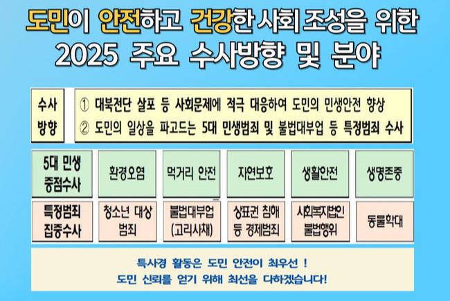 특사경은 도민 생활과 밀접한 환경오염, 의약품 및 건강기능식품 불법판매, 불법 숙박업 등 민생범죄를 우선적으로 다루며, 불법 대부업 척결과 청소년 유해물질 판매 단속 등 특정범죄에 대한 고강도 집중수사를 예고했다.