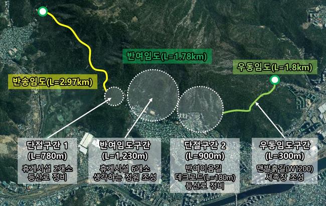 두 번째 반여 임도 단절 구간은 1천230m 전체를 맨발 흙길로 단장하고 휴게 쉼터를 6곳 조성했다. 휴게 쉼터에는 파고라, 전통정자 등 다양한 편의시설을 갖췄다. 또한, 반여 임도에서 우동 임도로 이어지는 단절 구간 900m에 데크로드(180m)를 만들고 등산로를 정비해 걷기 편해졌다.