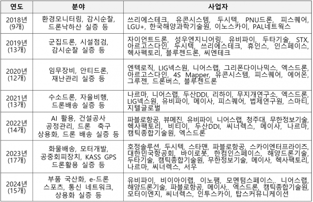 2023년까지 총 78개 사업자를 지원하며 유망 드론 비즈니스 모델 발굴, 우수 드론 기업 육성 등 국내 드론 산업을 견인했고 2024년에는 부품 국산화 및 e-드론 스포츠 등 15개 사업자를 선정해 실증을 통한 상용화를 지원 중에 있다.