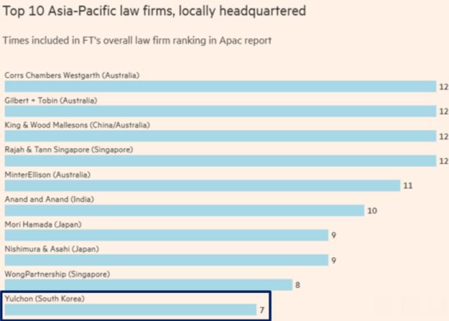 ▲ 아시아·태평양 지역 본사 소재 로펌 톱 10(FT의 아-태 지역 로펌 종합 순위에 이름을 올린 횟수) (사진=율촌 제공)