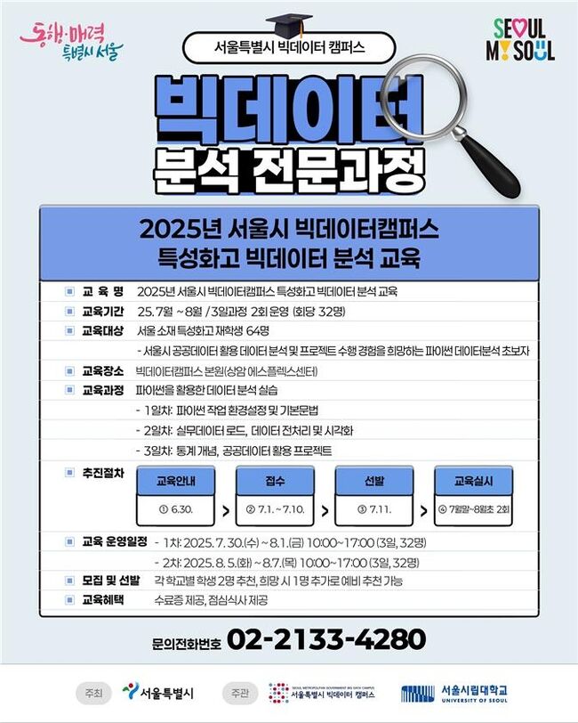 [e-뉴스 25=백지나 기자] 서울시는 여름방학 기간 서울시 내 특성화고 재학생 64명을 대상으로 '빅데이터 분석 교육'을 운영한다고 2일 밝혔다.