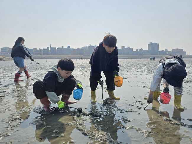 아이들이 갯벌에서 조개 캐기 체험을 하고 있다.