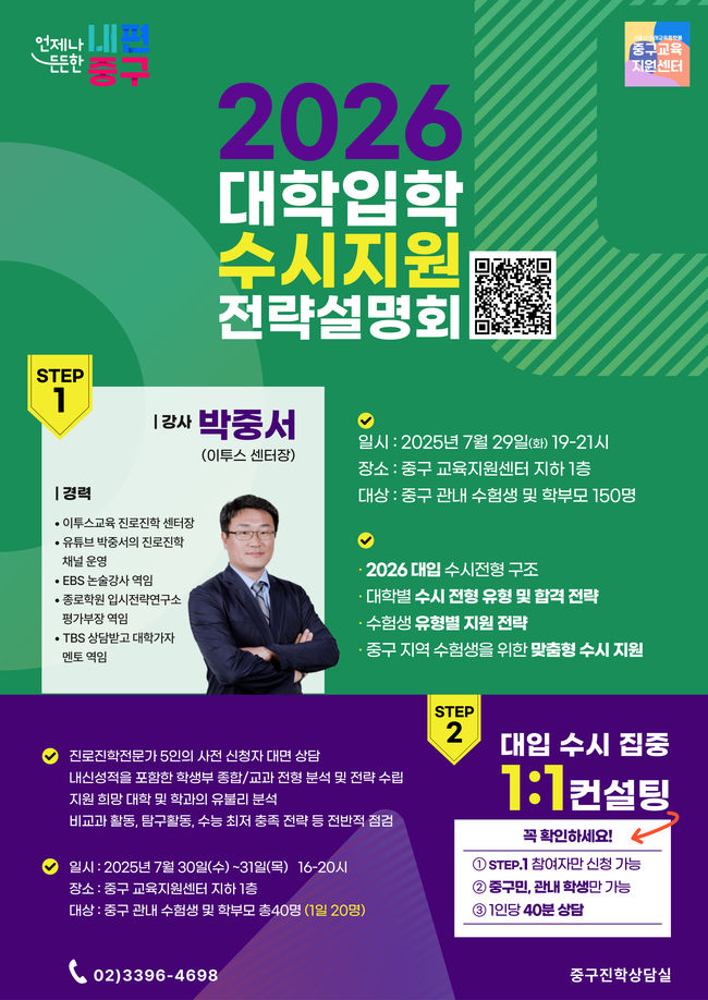 7월 29일 오후 7시부터 9시까지 중구 교육지원센터에서 열리는 ‘2026 대입 수시 지원 전략 설명회’는 중구 관내 수험생과 학부모 120명을 대상으로 진행된다. 설명회는 입시 전문 교육기업 이투스교육의 박중서 센터장이 맡아, △2026학년도 수시전형의 주요 변화 △대학별 수시 유형별 분석 △수험생 유형에 따른 지원 전략 △중구 수험생을 위한 맞춤 정보 등을 중심으로 진행된다. 참여 신청은 중구교육보육포털에서 7월 27일까지 접수받는다.