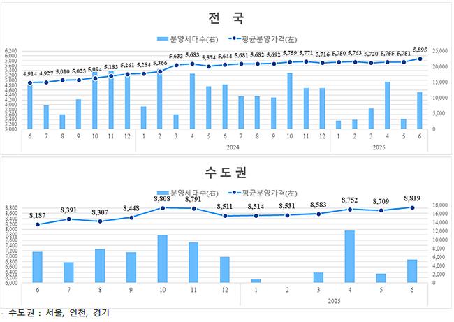 [e-뉴스 25=백지나 기자] 2025년 6월말 기준 전국 민간아파트의 ㎡당 평균 분양가격은 5,895천원으로, 전월보다 2.5% 상승했으며 신규 분양세대수는 1만1,793세대로 전년 동월 대비 2,498세대 감소했다.