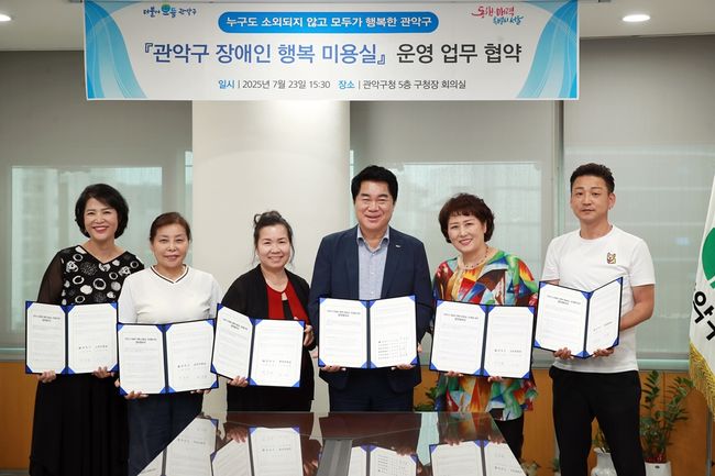 `관악구 장애인 행복 미용식` 운영 업무 협약식.관악구(구청장 박준희)는 지난 23일 관내 장애인들이 편리하게 미용 서비스를 이용할 수 있도록 ‘장애인 행복 미용실’ 운영 업무협약식을 개최했다. 이번 사업은 ‘2025년 서울시 약자와의 동행 자치구 지원사업’에 선정돼 시비 2천만 원을 확보했다.