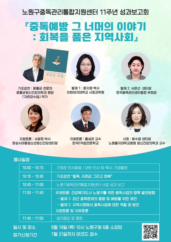 서울 노원구(구청장 오승록가 중독관리통합지원센터 개소 11주년을 맞아 오는 8월 14일 ‘중독예방, 그 너머의 이야기: 회복을 품은 지역사회’를 주제로 성과보고회를 개최한다. 보고회는 노원구청 소강당에서 오전 10시에 열리며 누구나 참석 가능하다.