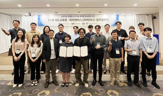 [e-뉴스 25=백지나 기자] ㈜미리디(대표 강창석)가 서울특별시교육청교육연구정보원(원장 임유원)과 업무협약(MOU)을 체결하고 11개 시도교육청을 대상으로 AI 디자인 솔루션 ‘미리캔버스’의 유료 라이선스를 무상 지원한다고 밝혔다.