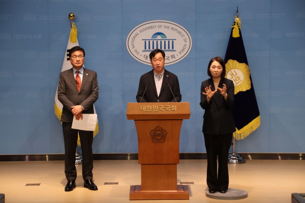 ▲ 김준혁 의원(가운데)과 김대식 의원(왼쪽)이 20일 국회 소통관에서 기자회견을 가지면서 공동대표 발의한 '인공지능 인재 육성 및 활용에 관한 특별법'에 대해 설명을 하고 있다. (사진=김준혁 의원실 제공)