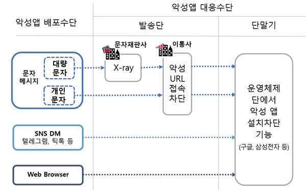 정부는 불법 스팸으로 악성앱 설치 유도 등을 막기 위해 문자사업자·이통사·개별 단말기에 이르는 3중 차단체계도 구축할 방침이다.