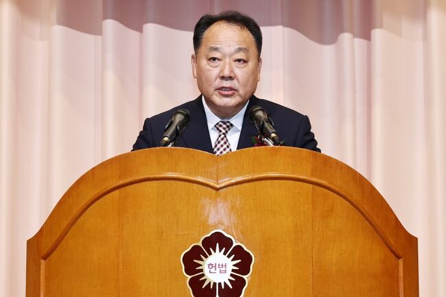 ▲ 손인혁 신임 헌법재판소 사무처장이 1일 오전 서울 종로구 헌법재판소에서 열린 취임식에서 취임사를 하고 있다. (사진=헌법재판소 제공)