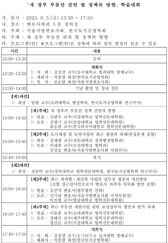 2세션은 성중탁 경북대 법전원 교수가 좌장을 맡아 최근 재개발·재건축 사업과 부동산 개발 사업의 실무상 문제점과 개선 방안을 논의한다.