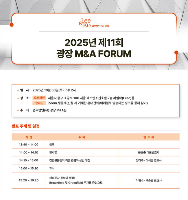 매년 가을 열리는 광장 M&A 포럼은 광장 기업자문·M&A그룹 파트너들이 최신 M&A 이슈를 소개하는 자리다. 올해로 11주년을 맞이한 이 행사는 매년 새롭고 알찬 내용으로 참가자들의 많은 호응을 받고 있다. 오프라인 좌석의 경우 100석이 훌쩍 넘는 규모임에도 불구하고 신청 개시 후 금세 마감이 될 정도로 인기를 끌고 있다.