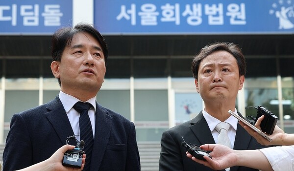 ▲ 티몬과 위메프의 회생절차 개시 결정이 내려진 10일 오후 서울 서초구 서울회생법원에서 류화현 위메프 대표(왼쪽)와 류광진 티몬 대표가 취재진 질문에 답하고 있다. (사진=연합뉴스)