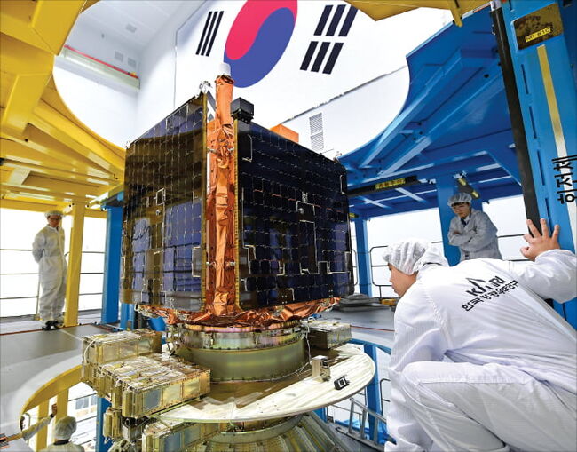 ▲ 전남 고흥 나로우주센터에서 한국항공우주연구원 연구진이 오는 27일 누리호 4차 발사에 탑재할 차세대중형위성3호(가운데)와 아래쪽 좌우에 달린 큐브위성 12기를 점검하고 있다. (사진=한국항공우주연구원 제공)