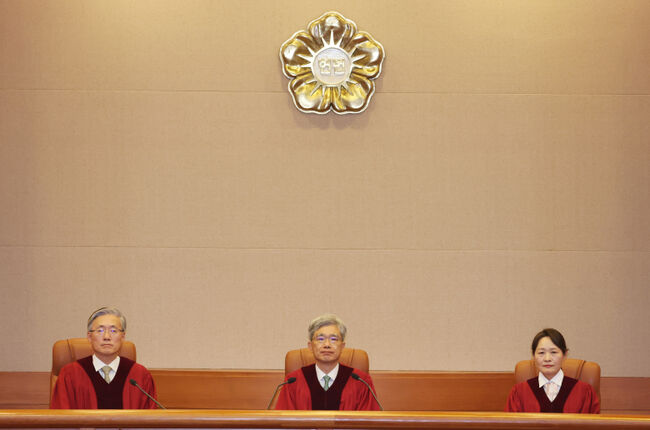 ▲ 김상환 헌법재판소장 등이 27일 서울 종로구 헌재 대심판정에서 11월 심판사건 선고를 앞두고 자리에 앉아 있다. (사진=연합뉴스)