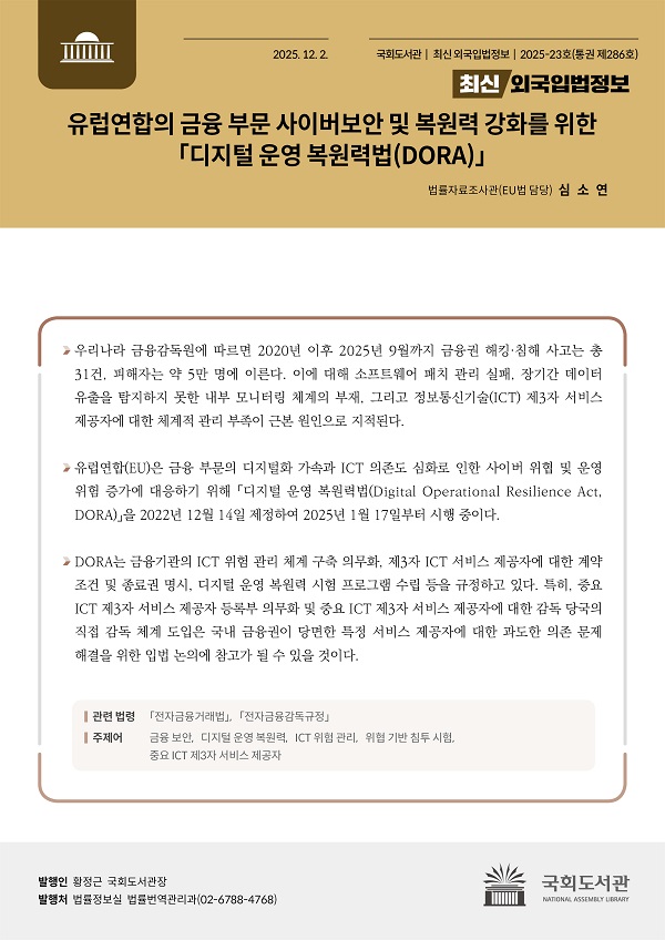 [e-뉴스 25=백지나 기자] 국회도서관은 2일 유럽연합(EU)의 금융 부문 사이버보안 및 복원력 강화를 위한 '디지털 운영 복원력법(Digital Operational Resilience Act, DORA)'을 주제로 한 '최신외국입법정보'(2025-23호)를 발간했다.