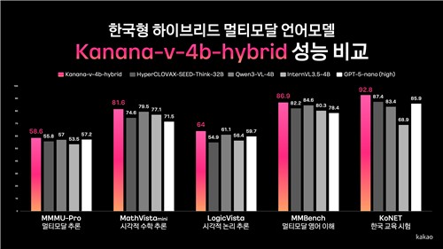 카카오는 5일 일상 대화부터 논리적 사고가 필요한 복잡한 문제 해결까지 하나의 모델로 처리할 수 있는 자체 개발 신규 AI 모델 '카나나-v-4b-하이브리드' 성능을 공개했다고 밝혔다.