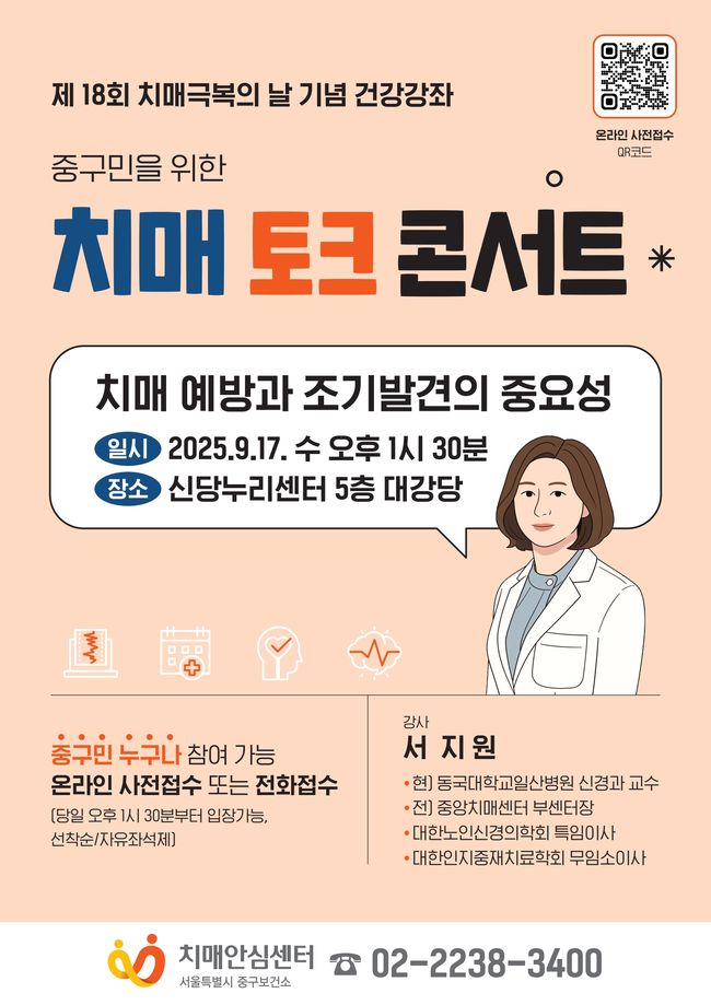 만 60세 이상 어르신은 2년마다 필수 검진을 받아야 하며, 연 1회 무료 기억력 검사를 받을 수 있다. 예약과 문의는 중구치매안심센터(02-2238-3400)에서 가능하다.