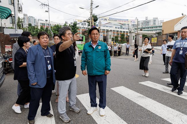 박강수 마포구청장이 서울여중고 앞 통학로를 점검하고 있다.마포구는 9일 교육청소년과, 구민안전과, 자치행정과 등 관계부서 긴급회의를 열어 통학로 안전 점검 계획과 실행방안을 논의했다.
