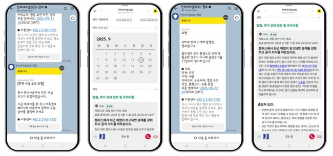 이 솔루션은 별도의 앱 설치 없이 카카오톡을 안전 관리 채널로 활용하도록 설계됐다. 인터내셔날SOS 글로벌 보안센터에서 수집·분석한 실시간 경보를 임직원의 위치와 연동해 맞춤형으로 전달하며, 실제 위험에 노출된 직원에게만 필요한 정보와 행동 지침을 제공해 대응 효율을 높인다.