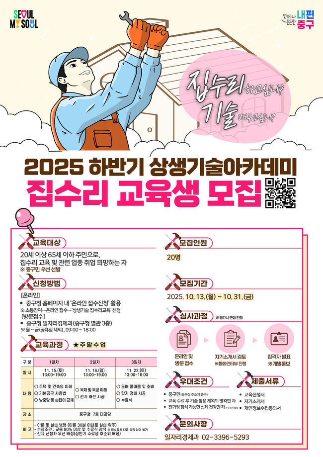 신청은 오는 10월 31일까지 가능하며, 온라인 또는 방문 접수로 진행된다. 온라인 접수는 중구청 누리집 ‘소통참여 → 온라인 접수신청 → 상생기술 집수리 교육’ 메뉴에서 가능하고, 방문 접수는 중구청 별관 3층 일자리경제과에서 할 수 있다.