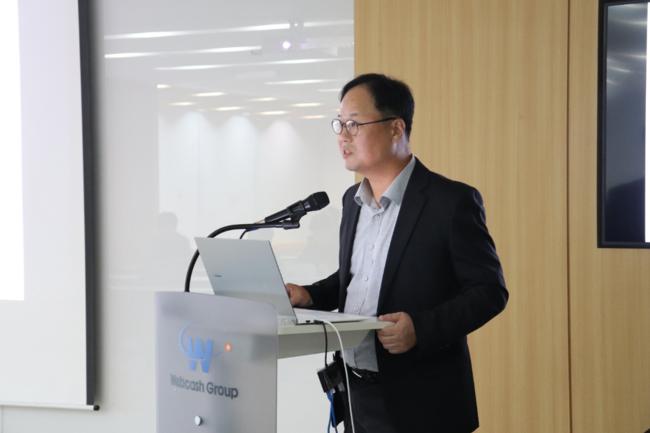 ▲ 쿠콘 심석민 상무가 2025년 3분기 실적 및 향후 전략을 설명하고 있다. (사진=쿠콘 제공)
